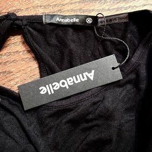 New with tags . Super comfy Annabelle Black Jumpsuit. 3/4 sleeve. Keyhole Back. Tie waist. Really nice. Size XL. Flat lay measurements are as follows and are approximate. Flare leg. 95% Rayon 5% Spandex Hand wash Cold . Line dry