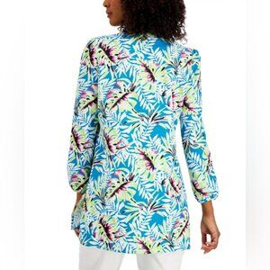 NWT ANNE KLEIN LINEN BLEND Tropical Blue Printed Split Neckline Long Puffed Sleeves Tunic Size 2X