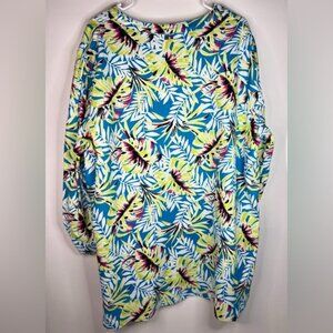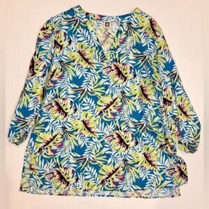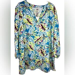 NWT ANNE KLEIN LINEN BLEND Tropical Blue/Sprout Printed Split Neckline Tunic 2X