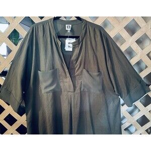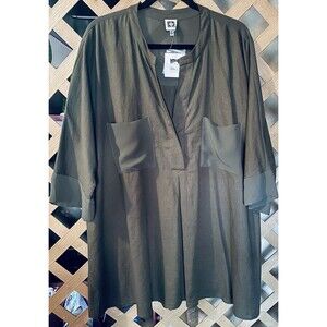 NWT ANNE KLEIN Linen Blend Mixed Media Olive Green High-Low Tunic 2X