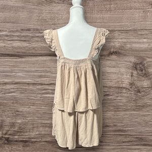 This set includes a square neck tank top with ruffled sleeves and a pair of matching shorts with an elastic waistband and side pockets.