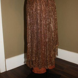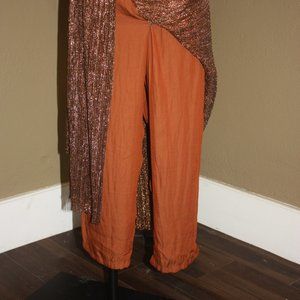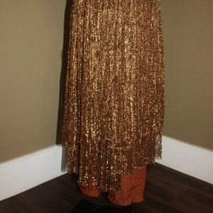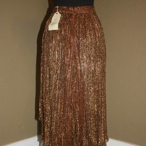BRAN NEW PANTS WITH SKIRT OVERLAY IN METALLIC GOLD COLOR. PANTS ARE TAPERED AND CROPPED. PRICE $128.00