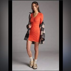 NWT Anthropologie Sundry Ruched Mini Dress. This one has Sundry Putting a chic French twist on a West Coast style, Sundry represents a refined take on getaway-inspired weekend wear. Designed by Provence-born Matthieu Leblan and crafted in California, each "Almost French" piece is an instant, iconic classic. Cotton, spandex Ruched detail V-neck Mini silhouette Pullover styling.