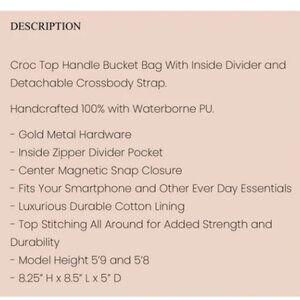 Beautiful vegan croc top handle bucket bag with inside divider, luxurious and durable cotton lining, top stitching for strength and durability, and gold metal hardware. Includes detachable crossbody strap. Very nice quality.