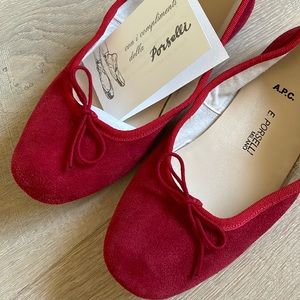 NWT A.P.C. Porselli Red Suede Ballet Flats. Size 36. Pristine, never been worn. Gorgeous red suede ballet flats for everyday and travel. Made by hand in Italy.