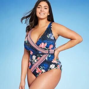 NWT AQUA GREEN Women's Floral Wrap Front One Piece Swimsuit Size Small