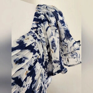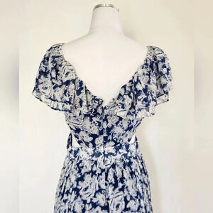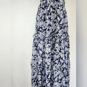 NWT maxi dress in size medium by Aqua, an exclusive by Bloomingdales. This is such a beautiful dress with many details. The front and back are both a v neck, with the front having a pleated cross-over look. The skirt is full, in a tiered maxi style. There is diamond shaped openings at ea hip, and a hidden zipper down the back. The colors are navy and white floral with gold flecks throughout. Dress is fully lined.