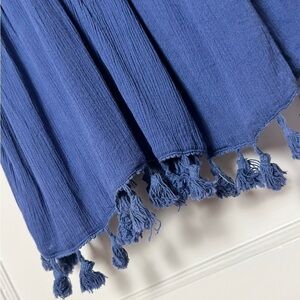 Boho-inspired loose a-line silhouette mini dress detailed with tassel fringe trims.