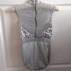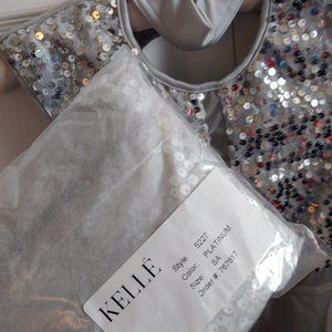 Brand new, still in package, size Adult Small Kellé Dance Costume Company platinum and silver sequin leotard with mesh detail, keyhole cutout on front, mock neck, quarter zip closure on back. Beautiful contemporary costume, we bought for a duet that we never took to competition.