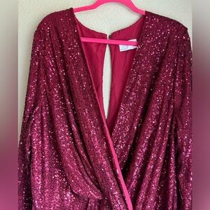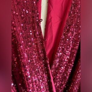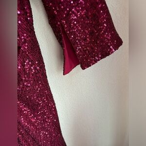 Stunning burgundy red sequin dress in a flattering faux wrap surplice style. Fluttery 3/4 length sleeves with small cutout at waist, v-neck, and side slit. Fully lined with invisible back zipper and buttons up the back.