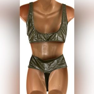 This body suit is a beautiful dark olive green. Semi shiny vinyl. Amazing for layering or rocking it as a top in warmer weather!