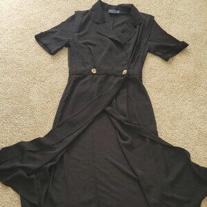 ASOS black lightweight office dress with lapel collar and button detail at waist. Wrap-style bottom.