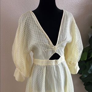 Stylish pale lemon yellow dress featuring puff sleeves and a chic cutout design. Perfect for special occasions.