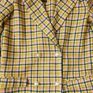 Elevate your style with this chic plaid women's jacket. Featuring a vibrant yellow and pink pattern, this jacket is perfect for any occasion. Plastic buttons.