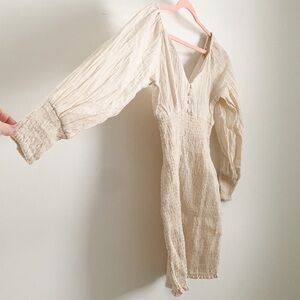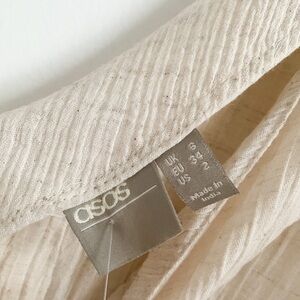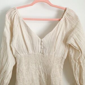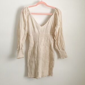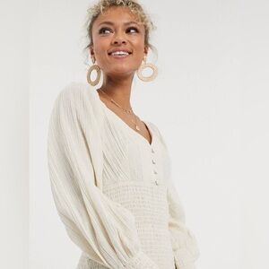 NWT ASOS Cream / stone colored Smocked Puff Sleeve Peasant Mini Dress. Size 2. Smocked body from under the bust down. Smocked cuffs. Gauze material throughout the top and sleeves. V neck and back. Cotton, linen blend. Elastic band at shoulders. From the bottom of the back V to the bottom hem it measures 22”.