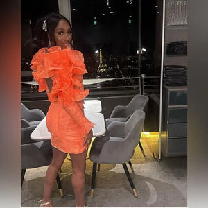 Mini dress by ASOS Luxe Red-carpet ready Plunge neck Ruffle details Open back Zip-back fastening Body-conscious fit