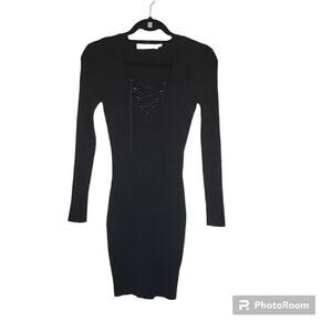 Perfect little party dress for the upcoming holidays Bodycon rib knit shimmery dress with lace up neckline.