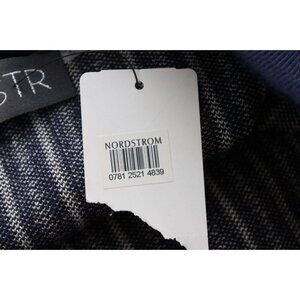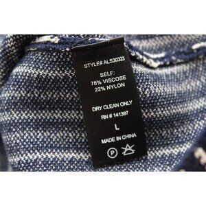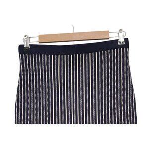 This is a new-with-tags ASTR pencil skirt in size large, featuring a knit design in navy and white stripes. The skirt is made of a stretchy material blend of nylon and viscose, with a high-rise waist and a knee-length hem. It has a pull-on closure for convenience and is suitable for various occasions like travel, parties, or casual wear. The skirt's straight and pencil style gives off a casual, city-chic, and preppy vibe, making it a versatile piece for summer, fall, and spring seasons.