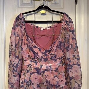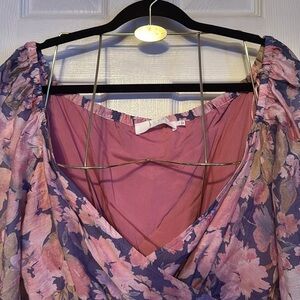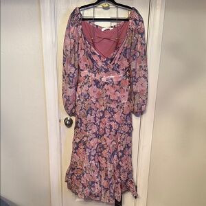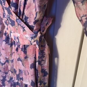 NWT This elegant sundress features a sweetheart neckline and bishop sleeves, perfect for a wedding guest or cocktail event. The dress showcases a flowing silhouette in beautiful shades of pink and purple, flowy skirt, offering both comfort and style.Wrap around style and ties at the waist. Very figure flattering for all body types.