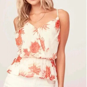 Gorgeous camisole tank top by ASTR The Label. “Strappy Floral Cami” style in "RED-TAUPE FLORAL" (orange-red flowers on a cream/ecru background). Draped cross-over front with criss-cross back spaghetti straps. Elastic waist with peplum. Bust approx 36“, waist 24-34”, length approx 20“ (adjustable w straps).