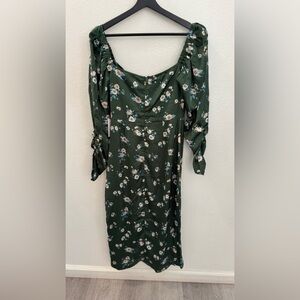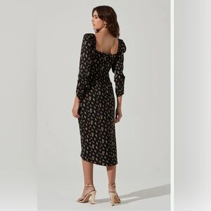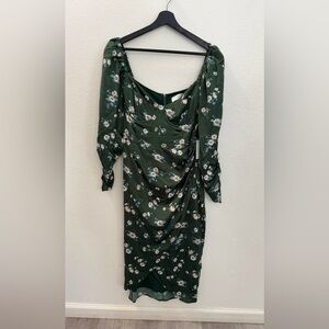 This elegant sheath dress by Astr features a striking green and white color palette, perfect for a wedding guest or cocktail event. The design includes a flattering sweetheart neckline, long bishop sleeves, and a stylish ruched detail with a side slit for added sophistication.