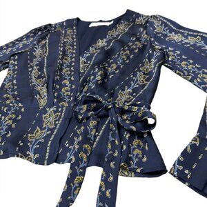 ✨ NWT ASTR the Label Kimi Navy Blue Print Long Sleeve Satin Wrap Top Size M ✨