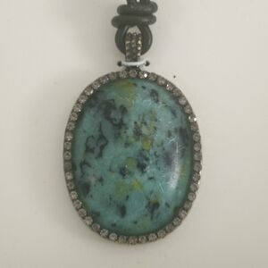 New with tags/New in box- Woman Owned brand ATTERRI reconstituted stone oval pendant necklace featuring an adjustable black cord. This beautiful oval pendant features a jadeite looking stone with flecks of gold and black surrounded by a crystal embedded border. Necklace can be worn up to 30 inches in length and is adjustable. This 90s inspired style is perfect for everyday wear!