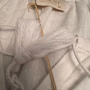 NWT- August blue and white linen dress with detachable sash. Size medium/large. Perfect condition. Super comfortable and lightweight. The waist measures 43 inches, the length is 34 inches, the sleeve length is 18 inches, and the best measures 44 inches.