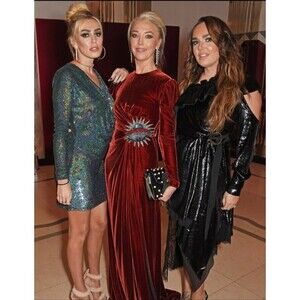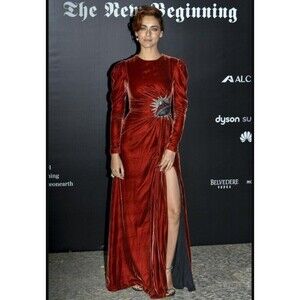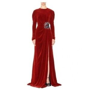 A long sleeve velvet gown with puff sleeves and a ufo that pays homage to a fascination with outer space. the ufo appliqué is handmade with beads, rhinestones, stones and sequin and gives a three-dimensional effect. the embroidery takes 30-36 hours to complete. ; silk lining; bordeaux velvet; gathered side detail with ufo appliqué ; strong shoulders; front slit; back zip closure; made in italy;