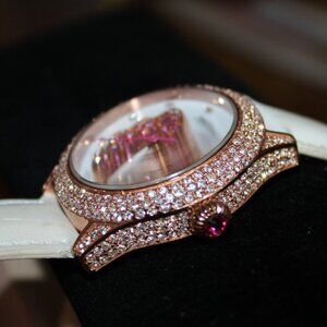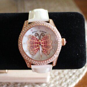 I have been collecting Betsey Johnson jewelry, watches, purses for 40 years. I have decided to thin some of my collection out. I bought this at Macys, comes from a smoke free home and is STUNNING. It is Brand New with tags and a Brand-New Battery. It has a pretty bling butterfly, has tons of bling all around the face, the butterfly is also full of pretty pink bling. The band is a pretty soft white iridescent. Rose gold. The dial nob has a pretty bright pink stone. This has a pretty vintage look. This is great for any collector. You will not be disappointed.