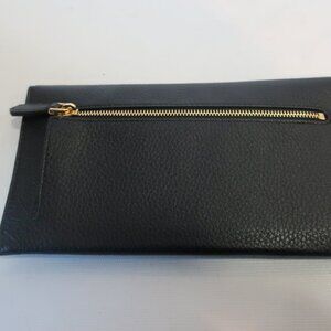 Elegant black leather wallet. Features gold logo detail. Sleek envelope design.