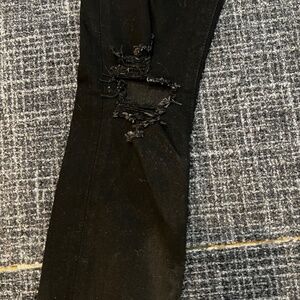 Trendy black skinny jeans with distressed details. Perfect for casual outings.