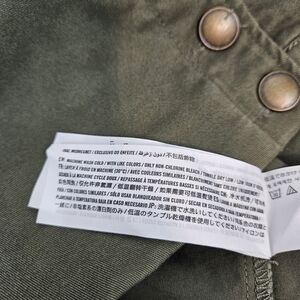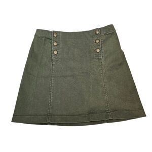 Features super soft olive green woven cotton, Y2K style, pull on with front button closure, brass buttons, falls at thighs, mini skirt, no stretch, no pockets, utility.