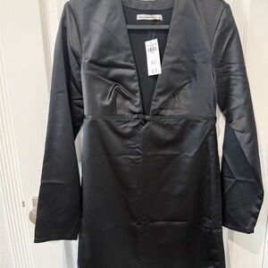 Chic black dress with long sleeves and a deep V-neck. Perfect for evening wear.