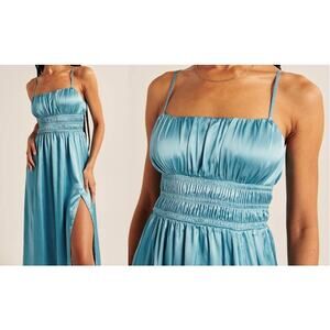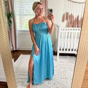 NWT Abercrombie & Fitch Smocked Bodice Side Slit Satin Maxi Dress Blue