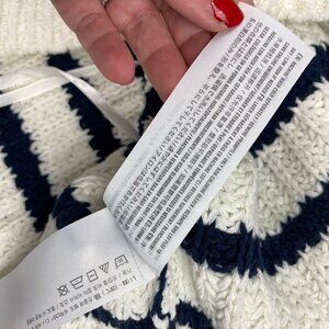 Chunky open knit sweater tank features boatneck, off white/cream and dark blue striped pattern. Boxy fit.