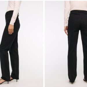 Our classic 90s straight jeans in our no-fade black wash, designed to resist fading of black denim for up to 10 washes, with a clean hem. This fit features an 11.5” ultra high rise, is fitted at top of body and eases through the thigh into a straight leg shape with a full-length inseam. This jean is made from our vintage stretch fabric which features both an authentic vintage look and contains slight built-in stretch for additional comfort. Imported.
