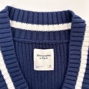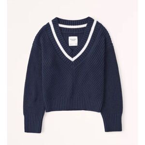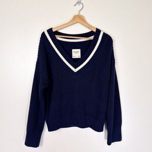 NWT Abercrombie & Fitch Tipped Wide V-Neck Relaxed Sweater Navy Blue Sz Medium