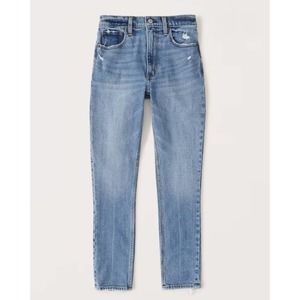 Abercrombie and Fitch's high rise skinny jean with figure-defining style and built-in stretch for superior comfort. This jean sits at the waist and looks great with your shirt tucked or untucked. With a form-fitting silhouette from top to bottom, this style is cropped to show a little ankle—and your favorite shoes. Featuring a medium indigo wash, crease detail, and distressed hem.