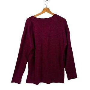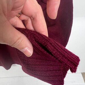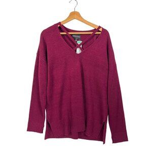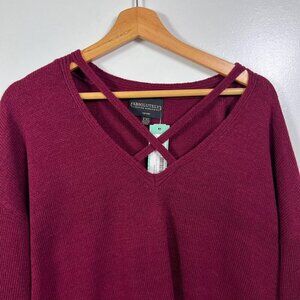 This NWT Absolutely Worldwide Creative Burgundy Sweater is a stylish addition to your wardrobe. Its vibrant burgundy color and unique strappy neckline design adds a trendy touch to your outfits.