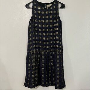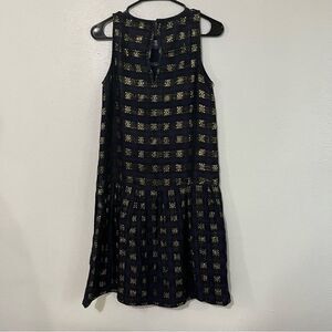 Beautiful drop waist dress in patina textile, a black & navy double gauze with metallic gold thread. The lining is Kyoto, blue and gray stripes with silver thread.