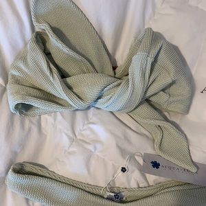 Perfect brand new condition. Tags and Sanitary sticker attached. Size small. This hand crafted designer Brazilian bikini is absolutely stunning. Removable padded inserts. Can be worn three different ways. Moderate coverage bottoms. Beautiful light seafoam color that is super versatile and goes with everything! “The bandeau lace up boosts cleavage, the ultra-stretch swim top pairs well with matching hiked up high leg throwback bottoms.” Purchased at SLS pop up in Miami.