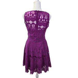Adorable purple lace overlay cut-out dress that is a fit & flare style. Back zipper closure and sleeveless. This is lined at the bustline and down through the skirt.