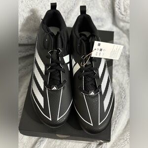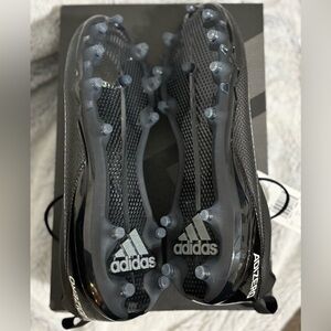 Dynamic Adidas Adizero cleats. Bold black with striking white stripes. Perfect for speed and agility.