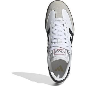 Adidas Men’s Samba Indoor Soccer Shoe, classic Cloud White with Black stripes and Vivid Red accents, size 8.5; durable leather upper, gum rubber sole for excellent indoor traction.