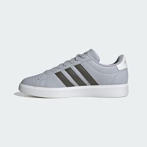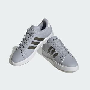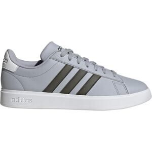 Adidas Men’s Grand Court 2.0 sneakers in Halo Silver, Shadow Olive, and White. Inspired by classic tennis shoes, these low-profile sneakers feature a full-grain leather upper, cushioned midsole, rubber cupsole, and branded 3‑stripes. Size 6