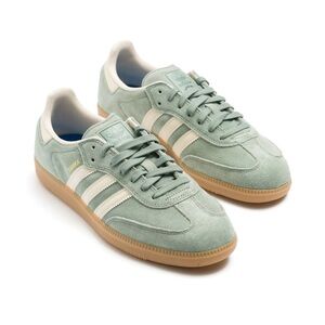 Stylish Adidas Samba sneakers in mint green with cream stripes. Features a classic gum sole.