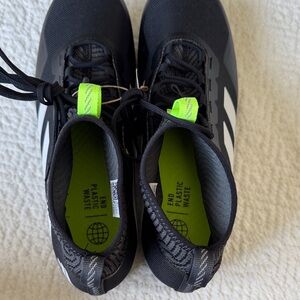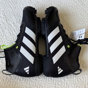 Adidas shoes with a modern look. Black base with lime green highlights. Iconic white stripes on the side.