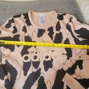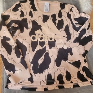 unique and stylish sweatshirt with tan and black allover spots and Adidas logo on front