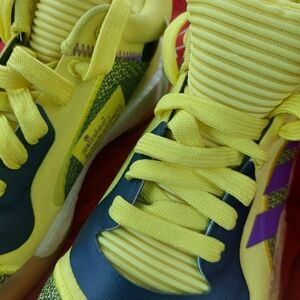 Bold yellow Adidas sneakers featuring purple stripes and black details. Eye-catching design.